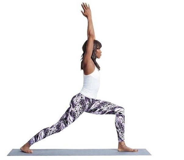Встань прямо, соединив стопы, так чтобы пятки и большие пальцы ног соприкасались. Сложи руки ладонями на уровне груди. Напряги колени, подтяни кверху коленные чашечки, сожми верхнюю часть бедер и подтяни задние бедренные мышцы. Втяни живот, грудью подайся вперед, вытяни позвоночник вверх, шею держи прямо. На выдохе отставь левую ногу так, чтобы левая пятка была на одной линии с правой. Поверни левую ступню на 45 градусов. На вдохе подними руки параллельно друг другу к потолку. Выдохни, втяни живот. Левая нога твердо стоит на полу. Медленно сгибай правое колено, опираясь на пятку. Правая голень должна быть перпендикулярна полу, а левое бедро параллельно ему. Смотри перед собой и задержись на 5 вдохов. Вернись в исходное положение.
